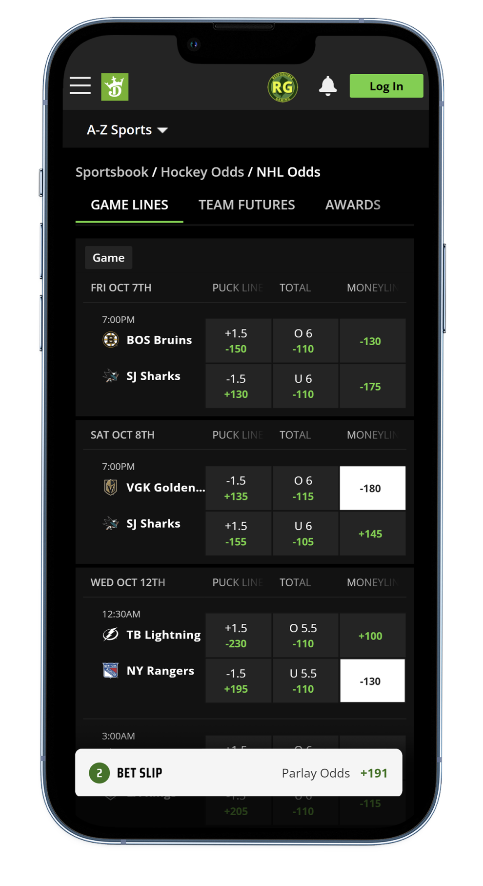 DraftKings NHL Parlay screenshot 2